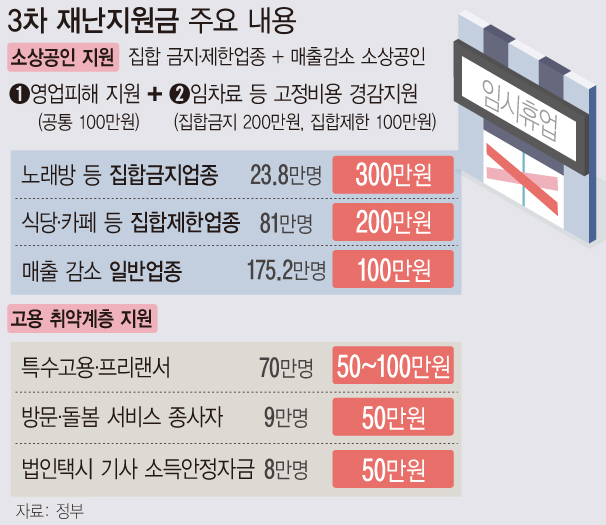 중앙재난안전대책본부・지방자치단체의 방역강화로 집합금지 또는 영업제한된 소상공인에 각각 300만원, 200만원◦ 「감염병예방법」에 따라 중대본*·지자체**가 ’20.11.24 이후 시행한 집합금지·영업제한 업종 기준* (수도권) 거리두기 2.5단계 (비수도권) 거리두기 2단계 (공통) 연말연시 특별방역** 지자체별 별도 방역조치 포함◦ 집합금지・영업제한 조치 위반시 지원 제외(위반사실 확인시 환수) |
